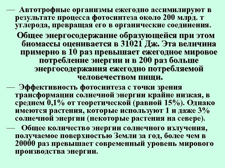 — Автотрофные организмы ежегодно ассимилируют в результате процесса фотосинтеза около 200 млрд. т углерода, превращая его в органические соединения. Общее энергосодержание образующейся при этом биомассы оценивается в 31021 Дж. Эта величина примерно в 10 раз превышает ежегодное мировое потребление энергии и в 200 раз больше энергосодержания ежегодно потребляемой человечеством пищи. — Эффективность фотосинтеза с точки зрения трансформации солнечной энергии крайне низкая, в среднем 0, 1% от теоретической (равной 15%). Однако имеются растения, которые используют 1 и даже 3% солнечной энергии (некоторые растения на севере). — Общее количество энергии солнечного излучения, получаемое поверхностью Земли за год, более чем в 20000 раз превышает современный уровень мирового производства энергии.