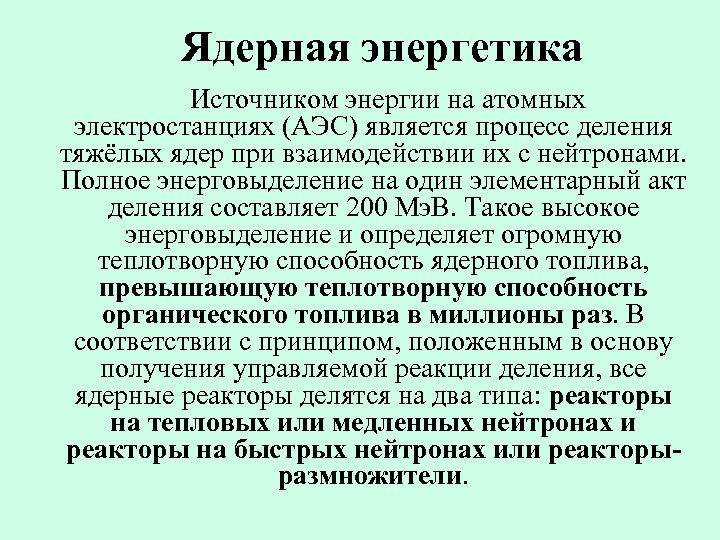 Ядерная энергетика Источником энергии на атомных электростанциях (АЭС) является процесс деления тяжёлых ядер при взаимодействии их с нейтронами. Полное энерговыделение на один элементарный акт деления составляет 200 Мэ. В. Такое высокое энерговыделение и определяет огромную теплотворную способность ядерного топлива, превышающую теплотворную способность органического топлива в миллионы раз. В соответствии с принципом, положенным в основу получения управляемой реакции деления, все ядерные реакторы делятся на два типа: реакторы на тепловых или медленных нейтронах и реакторы на быстрых нейтронах или реакторы размножители.