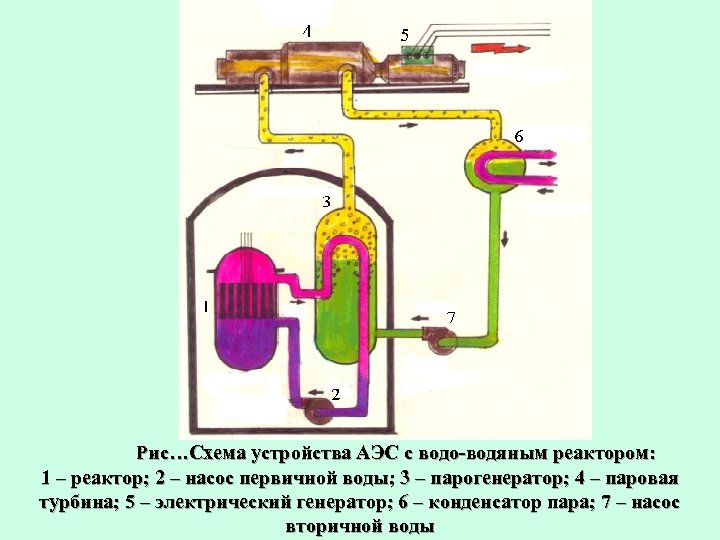 Рис…Схема устройства АЭС с водо водяным реактором: 1 – реактор; 2 – насос первичной воды; 3 – парогенератор; 4 – паровая турбина; 5 – электрический генератор; 6 – конденсатор пара; 7 – насос вторичной воды