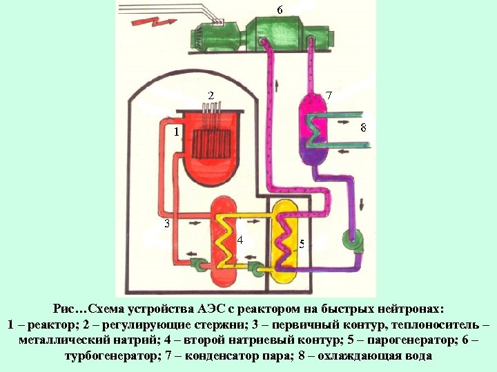 Рис…Схема устройства АЭС с реактором на быстрых нейтронах: 1 – реактор; 2 – регулирующие стержни; 3 – первичный контур, теплоноситель – металлический натрий; 4 – второй натриевый контур; 5 – парогенератор; 6 – турбогенератор; 7 – конденсатор пара; 8 – охлаждающая вода