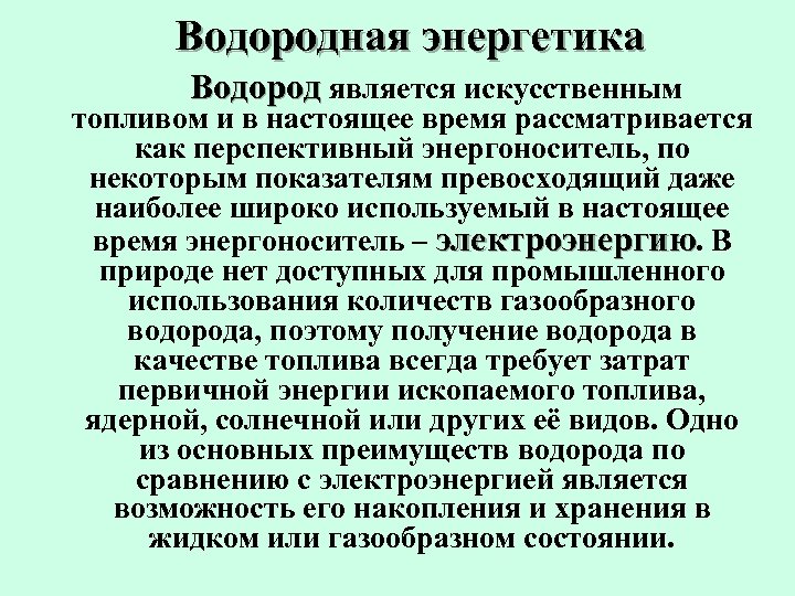 Водородная энергетика Водород является искусственным топливом и в настоящее время рассматривается как перспективный энергоноситель, по некоторым показателям превосходящий даже наиболее широко используемый в настоящее время энергоноситель – электроэнергию. В природе нет доступных для промышленного использования количеств газообразного водорода, поэтому получение водорода в качестве топлива всегда требует затрат первичной энергии ископаемого топлива, ядерной, солнечной или других её видов. Одно из основных преимуществ водорода по сравнению с электроэнергией является возможность его накопления и хранения в жидком или газообразном состоянии.