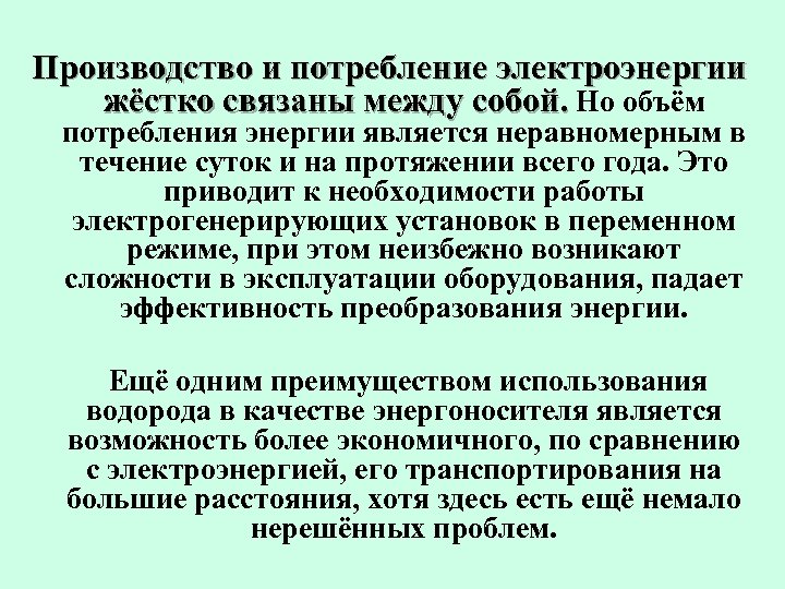 Производство и потребление электроэнергии жёстко связаны между собой. Но объём потребления энергии является неравномерным в течение суток и на протяжении всего года. Это приводит к необходимости работы электрогенерирующих установок в переменном режиме, при этом неизбежно возникают сложности в эксплуатации оборудования, падает эффективность преобразования энергии. Ещё одним преимуществом использования водорода в качестве энергоносителя является возможность более экономичного, по сравнению с электроэнергией, его транспортирования на большие расстояния, хотя здесь есть ещё немало нерешённых проблем.