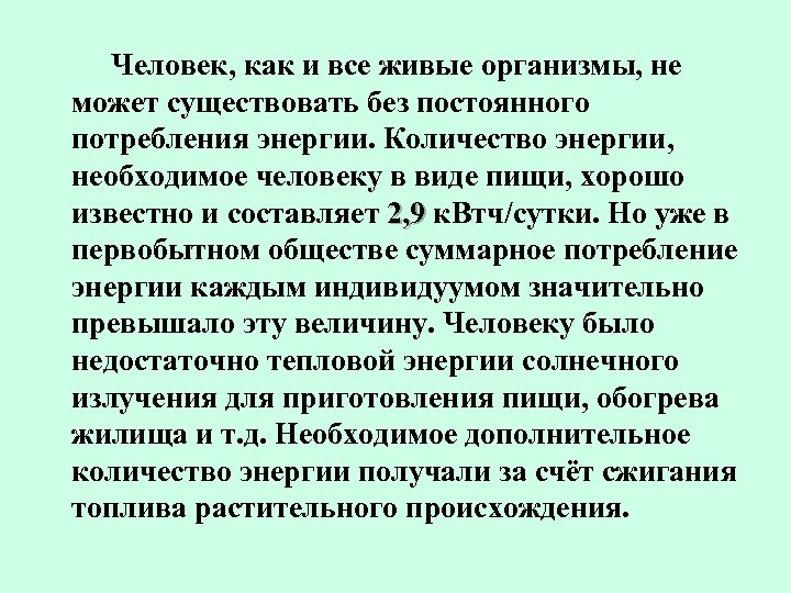 Человек, как и все живые организмы, не может существовать без постоянного потребления энергии. Количество энергии, необходимое человеку в виде пищи, хорошо известно и составляет 2, 9 к. Втч/сутки. Но уже в 2, 9 первобытном обществе суммарное потребление энергии каждым индивидуумом значительно превышало эту величину. Человеку было недостаточно тепловой энергии солнечного излучения для приготовления пищи, обогрева жилища и т. д. Необходимое дополнительное количество энергии получали за счёт сжигания топлива растительного происхождения.