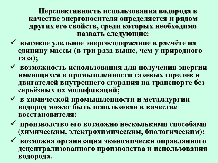 Перспективность использования водорода в качестве энергоносителя определяется и рядом других его свойств, среди которых необходимо назвать следующие: ü высокое удельное энергосодержание в расчёте на единицу массы (в три раза выше, чем у природного газа); ü возможность использования для получения энергии имеющихся в промышленности газовых горелок и двигателей внутреннего сгорания на транспорте без серьёзных их модификаций; ü в химической промышленности и металлургии водород может быть использован в качестве восстановителя; ü производство его возможно несколькими способами (химическим, электрохимическим, биологическим); ü возможна организация экономически оправданного децентрализованного производства и использования водорода.