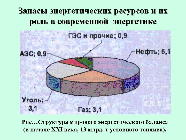 Запасы энергетических ресурсов и их роль в современной энергетике Рис…Структура мирового энергетического баланса (в начале ХХI века, 13 млрд. т условного топлива).