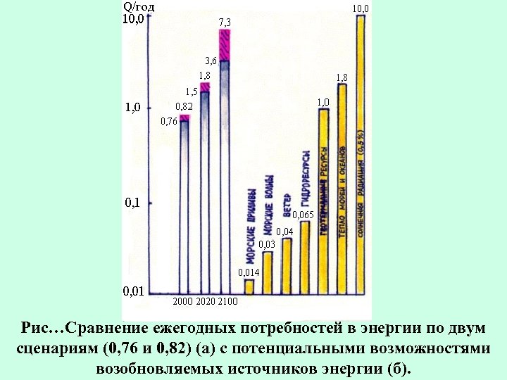 Рис…Сравнение ежегодных потребностей в энергии по двум сценариям (0, 76 и 0, 82) (а) с потенциальными возможностями возобновляемых источников энергии (б).