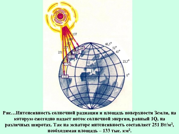 Рис…Интенсивность солнечной радиации и площадь поверхности Земли, на которую ежегодно падает поток солнечной энергии, равный 1 Q, на различных широтах. Так на экваторе интенсивность составляет 251 Вт/м 2, необходимая площадь – 133 тыс. км 2.