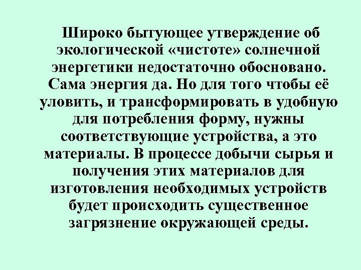 Широко бытующее утверждение об экологической «чистоте» солнечной энергетики недостаточно обосновано. Сама энергия да. Но для того чтобы её уловить, и трансформировать в удобную для потребления форму, нужны соответствующие устройства, а это материалы. В процессе добычи сырья и получения этих материалов для изготовления необходимых устройств будет происходить существенное загрязнение окружающей среды.