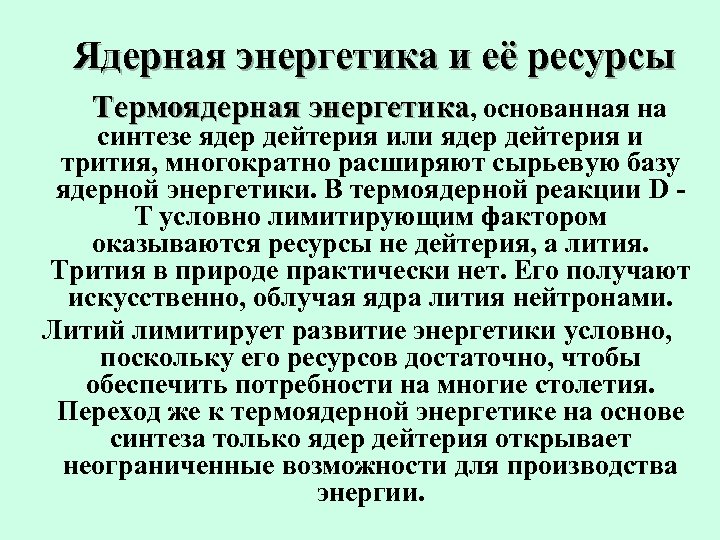 Ядерная энергетика и её ресурсы Термоядерная энергетика, основанная на синтезе ядер дейтерия или ядер дейтерия и трития, многократно расширяют сырьевую базу ядерной энергетики. В термоядерной реакции D Т условно лимитирующим фактором оказываются ресурсы не дейтерия, а лития. Трития в природе практически нет. Его получают искусственно, облучая ядра лития нейтронами. Литий лимитирует развитие энергетики условно, поскольку его ресурсов достаточно, чтобы обеспечить потребности на многие столетия. Переход же к термоядерной энергетике на основе синтеза только ядер дейтерия открывает неограниченные возможности для производства энергии.