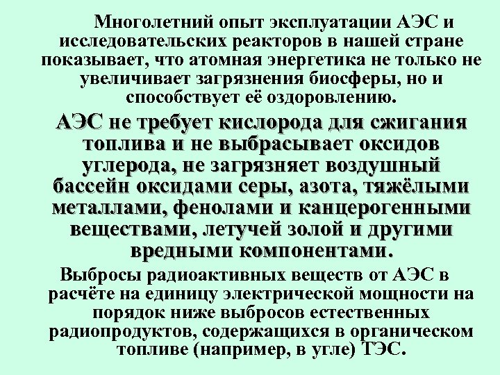 Многолетний опыт эксплуатации АЭС и исследовательских реакторов в нашей стране показывает, что атомная энергетика не только не увеличивает загрязнения биосферы, но и способствует её оздоровлению. АЭС не требует кислорода для сжигания топлива и не выбрасывает оксидов углерода, не загрязняет воздушный бассейн оксидами серы, азота, тяжёлыми металлами, фенолами и канцерогенными веществами, летучей золой и другими вредными компонентами. Выбросы радиоактивных веществ от АЭС в расчёте на единицу электрической мощности на порядок ниже выбросов естественных радиопродуктов, содержащихся в органическом топливе (например, в угле) ТЭС.