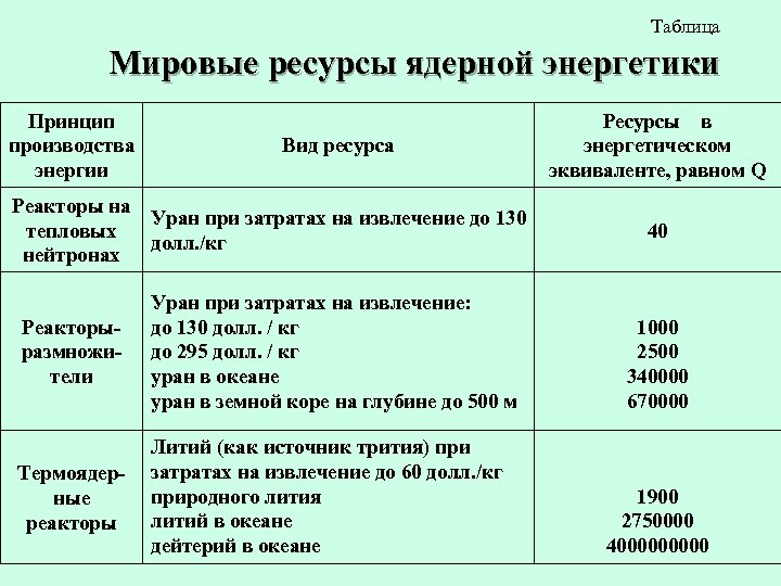 Таблица Мировые ресурсы ядерной энергетики Принцип производства энергии Вид ресурса Реакторы на Уран при затратах на извлечение до 130 тепловых долл. /кг нейтронах Ресурсы в энергетическом эквиваленте, равном Q 40 Реакторы размножи тели Уран при затратах на извлечение: до 130 долл. / кг до 295 долл. / кг уран в океане уран в земной коре на глубине до 500 м 1000 2500 340000 670000 Термоядер ные реакторы Литий (как источник трития) при затратах на извлечение до 60 долл. /кг природного лития литий в океане дейтерий в океане 1900 2750000 400000