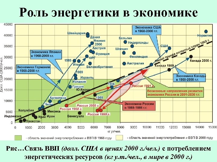Роль энергетики в экономике Рис…Связь ВВП (долл. США в ценах 2000 г. /чел. ) с потреблением энергетических ресурсов (кг у. т. /чел. , в мире в 2000 г. )