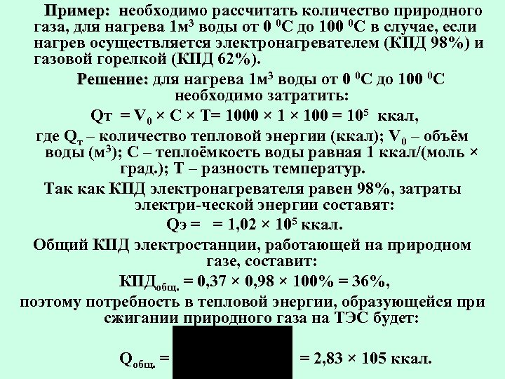 Пример: необходимо рассчитать количество природного Пример: н газа, для нагрева 1 м 3 воды от 0 0 С до 100 0 С в случае, если нагрев осуществляется электронагревателем (КПД 98%) и газовой горелкой (КПД 62%). Решение: для нагрева 1 м 3 воды от 0 0 С до 100 0 С Решение: необходимо затратить: Qт = V 0 × C × Т= 1000 × 100 = 105 ккал, где Qт – количество тепловой энергии (ккал); V 0 – объём воды (м 3); С – теплоёмкость воды равная 1 ккал/(моль × град. ); Т – разность температур. Так как КПД электронагревателя равен 98%, затраты электри ческой энергии составят: Qэ = = 1, 02 × 105 ккал. Общий КПД электростанции, работающей на природном газе, составит: КПДобщ. = 0, 37 × 0, 98 × 100% = 36%, поэтому потребность в тепловой энергии, образующейся при сжигании природного газа на ТЭС будет: Qобщ. = = 2, 83 × 105 ккал.