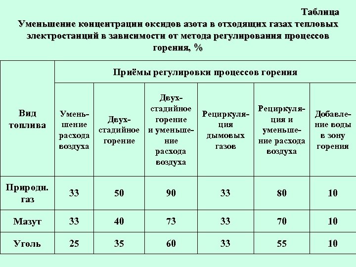 Таблица Уменьшение концентрации оксидов азота в отходящих газах тепловых электростанций в зависимости от метода регулирования процессов горения, % Приёмы регулировки процессов горения Вид топлива Двух стадийное Рециркуля Умень Рециркуля Добавле Двух горение ция и шение ция ние воды стадийное и уменьше расхода дымовых в зону ние горение расхода воздуха газов горения расхода воздуха Природн. газ 33 50 90 33 80 10 Мазут 33 40 73 33 70 10 Уголь 25 35 60 33 55 10