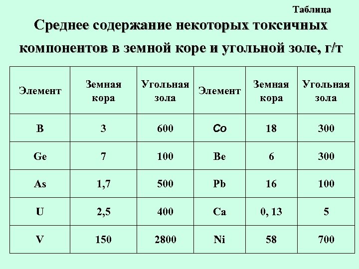Таблица Среднее содержание некоторых токсичных компонентов в земной коре и угольной золе, г/т Элемент Земная кора Угольная Элемент зола Земная Угольная кора зола B 3 600 Co 18 300 Ge 7 100 Be 6 300 As 1, 7 500 Pb 16 100 U 2, 5 400 Ca 0, 13 5 V 150 2800 Ni 58 700