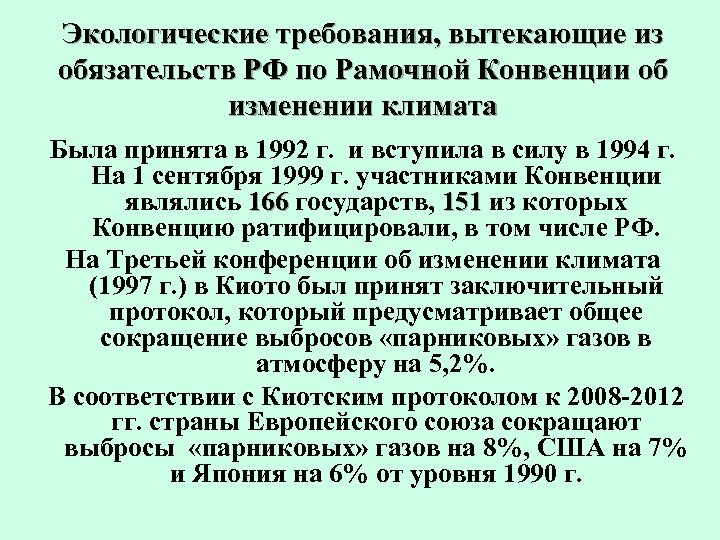 Экологические требования, вытекающие из обязательств РФ по Рамочной Конвенции об изменении климата Была принята в 1992 г. и вступила в силу в 1994 г. На 1 сентября 1999 г. участниками Конвенции являлись 166 государств, 151 из которых 166 151 Конвенцию ратифицировали, в том числе РФ. На Третьей конференции об изменении климата (1997 г. ) в Киото был принят заключительный протокол, который предусматривает общее сокращение выбросов «парниковых» газов в атмосферу на 5, 2%. В соответствии с Киотским протоколом к 2008 2012 гг. страны Европейского союза сокращают выбросы «парниковых» газов на 8%, США на 7% и Япония на 6% от уровня 1990 г.