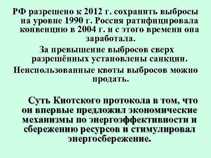 РФ разрешено к 2012 г. сохранить выбросы на уровне 1990 г. Россия ратифицировала конвенцию в 2004 г. и с этого времени она заработала. За превышение выбросов сверх разрешённых установлены санкции. Неиспользованные квоты выбросов можно продать. Суть Киотского протокола в том, что он впервые предложил экономические механизмы по энергоэффективности и сбережению ресурсов и стимулировал энергосбережение.