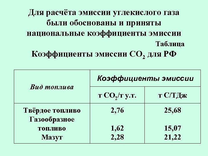 Для расчёта эмиссии углекислого газа были обоснованы и приняты национальные коэффициенты эмиссии Таблица Коэффициенты эмиссии СО 2 для РФ Коэффициенты эмиссии Вид топлива т СО 2/т у. т. Твёрдое топливо Газообразное топливо Мазут т С/ТДж 2, 76 25, 68 1, 62 2, 28 15, 07 21, 22