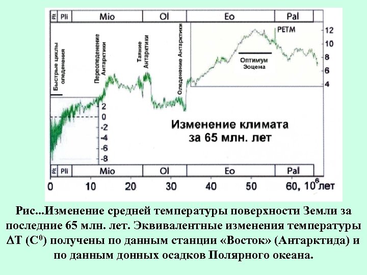 Рис. . . Изменение средней температуры поверхности Земли за последние 65 млн. лет. Эквивалентные изменения температуры Т (С 0) получены по данным станции «Восток» (Антарктида) и по данным донных осадков Полярного океана.