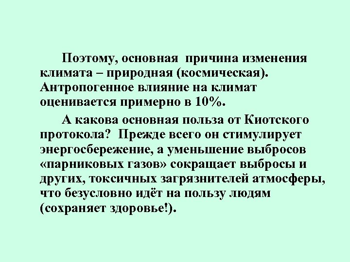 Основная причина изменения климата космическая. Антропогенное влияние на климат оценивается примерно в 10%. Киотского протокола прежде всего стимулирует энергосбережение, а уменьшение выбросов «парниковых газов» сокращает выбросы и других, токсичных загрязнителей атмосферы, что безусловно идёт на пользу людям (сохраняет здоровье!).