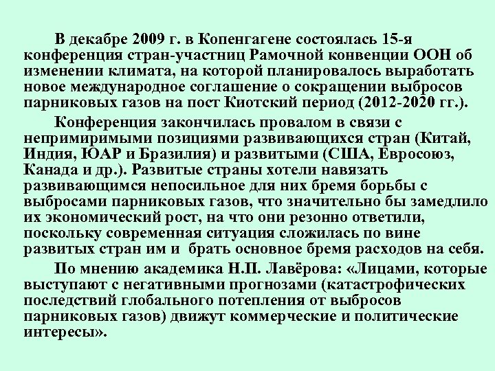 В декабре 2009 г. в Копенгагене состоялась 15 я конференция стран участниц Рамочной конвенции ООН об изменении климата, на которой планировалось выработать новое международное соглашение о сокращении выбросов парниковых газов на пост Киотский период (2012 2020 гг. ). Конференция закончилась провалом в связи с непримиримыми позициями развивающихся стран (Китай, Индия, ЮАР и Бразилия) и развитыми (США, Евросоюз, Канада и др. ). Развитые страны хотели навязать развивающимся непосильное для них бремя борьбы с выбросами парниковых газов, что значительно бы замедлило их экономический рост, на что они резонно ответили, поскольку современная ситуация сложилась по вине развитых стран им и брать основное бремя расходов на себя. По мнению академика Н. П. Лавёрова: «Лицами, которые выступают с негативными прогнозами (катастрофических последствий глобального потепления от выбросов парниковых газов) движут коммерческие и политические интересы» .