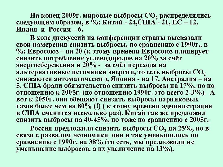 На конец 2009 г. мировые выбросы СО 2 распределялись следующим образом, в %: Китай 24, США 21, ЕС – 12, Индия и Россия – 6. В ходе дискуссий на конференции страны высказали свои намерения снизить выбросы, по сравнению с 1990 г. , в %: Евросоюз – на 20 (к этому времени Евросоюз планирует снизить потребление углеводородов на 20% за счёт энергосбережения и 20% за счёт перехода на альтернативные источники энергии, то есть выбросы СО 2 снижаются автоматически ), Япония на 17, Австралия – на 5. США брали обязательство снизить выбросы на 17%, но по отношению к 2005 г. (по отношению 1990 г. это всего 2 3%). А вот к 2050 г. они обещают снизить выбросы парниковых газов более чем на 80% (!) ( к этому времени администрация в США сменится несколько раз). Китай так же предложил снизить выбросы на 40 45%, но тоже по сравнению с 2005 г. Россия предложила снизить выбросы СО 2 на 25%, но в связи с развалом экономики они и так уменьшились по сравнению с 1990 г. на 38% (то есть, мы предложили не уменьшение выбросов, а их увеличение на 13%).