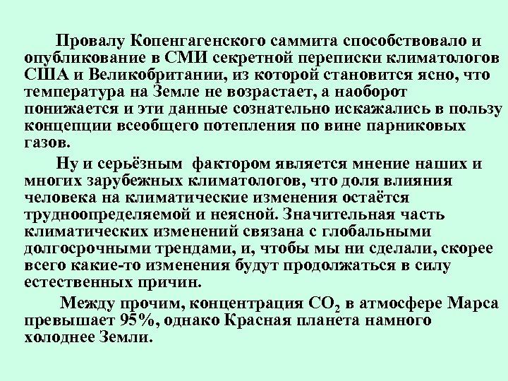 Провалу Копенгагенского саммита способствовало и опубликование в СМИ секретной переписки климатологов США и Великобритании, из которой становится ясно, что температура на Земле не возрастает, а наоборот понижается и эти данные сознательно искажались в пользу концепции всеобщего потепления по вине парниковых газов. Ну и серьёзным фактором является мнение наших и многих зарубежных климатологов, что доля влияния человека на климатические изменения остаётся трудноопределяемой и неясной. Значительная часть климатических изменений связана с глобальными долгосрочными трендами, и, чтобы мы ни сделали, скорее всего какие то изменения будут продолжаться в силу естественных причин. Между прочим, концентрация СО 2 в атмосфере Марса превышает 95%, однако Красная планета намного холоднее Земли.