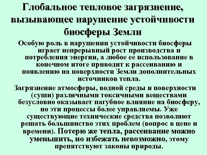 Глобальное тепловое загрязнение, вызывающее нарушение устойчивости биосферы Земли Особую роль в нарушении устойчивости биосферы играет непрерывный рост производства и потребления энергии, а любое ее использование в конечном итоге приводит к рассеиванию и появлению на поверхности Земли дополнительных источников тепла. Загрязнение атмосферы, водной среды и поверхности (суши) различными токсичными веществами безусловно оказывает пагубное влияние на биосферу, но эти процессы более управляемы. Уже существующие технические средства позволяют решать большинство этих проблем (вопрос в цене и времени). Потерю же тепла, рассеивание можно уменьшить, но избежать невозможно, этому препятствуют законы природы.