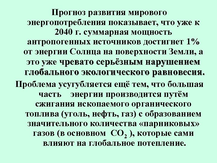 Прогноз развития мирового энергопотребления показывает, что уже к 2040 г. суммарная мощность антропогенных источников достигнет 1% от энергии Солнца на поверхности Земли, а это уже чревато серьёзным нарушением глобального экологического равновесия. Проблема усугубляется ещё тем, что большая часть энергии производится путём сжигания ископаемого органического топлива (уголь, нефть, газ) с образованием значительного количества «парниковых» газов (в основном СО 2 ), которые сами влияют на глобальное потепление.