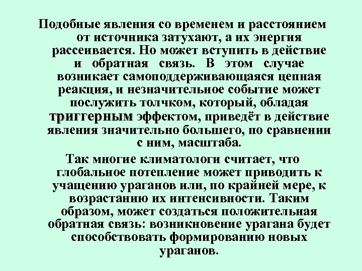 Подобные явления со временем и расстоянием от источника затухают, а их энергия рассеивается. Но может вступить в действие и обратная связь. В этом случае возникает самоподдерживающаяся цепная реакция, и незначительное событие может послужить толчком, который, обладая триггерным эффектом, приведёт в действие явления значительно большего, по сравнении с ним, масштаба. Так многие климатологи считает, что глобальное потепление может приводить к учащению ураганов или, по крайней мере, к возрастанию их интенсивности. Таким образом, может создаться положительная обратная связь: возникновение урагана будет способствовать формированию новых ураганов.