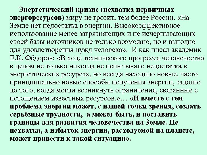 Энергетический кризис (нехватка первичных энергоресурсов) миру не грозит, тем более России. «На Земле нет недостатка в энергии. Высокоэффективное использование менее загрязняющих и не исчерпывающих своей базы источников не только возможно, но и выгодно для удовлетворения нужд человека» . И как писал академик Е. К. Фёдоров: «В ходе технического прогресса человечество в целом не только никогда не испытывало недостатка в энергетических ресурсах, но всегда находило новые, часто принципиально новые способы получения энергии, задолго до того, когда могли возникнуть ограничения, связанные с истощением известных ресурсов. » … «И вместе с тем проблема энергии может, с нашей точки зрения, создать серьёзные трудности, а может быть, и поставить границы для развития человечества на Земле. Не нехватка, а избыток энергии, расходуемой на планете, может привести к такой ситуации» .
