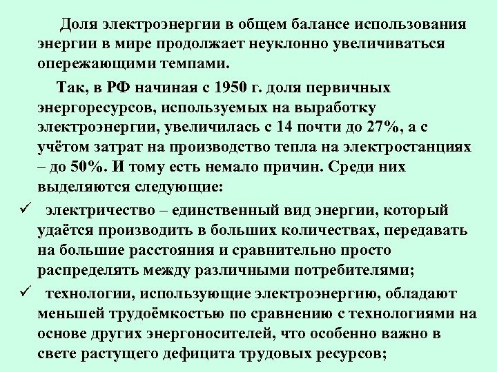 Доля электроэнергии в общем балансе использования энергии в мире продолжает неуклонно увеличиваться опережающими темпами. Так, в РФ начиная с 1950 г. доля первичных энергоресурсов, используемых на выработку электроэнергии, увеличилась с 14 почти до 27%, а с учётом затрат на производство тепла на электростанциях – до 50%. И тому есть немало причин. Среди них выделяются следующие: ü электричество – единственный вид энергии, который удаётся производить в больших количествах, передавать на большие расстояния и сравнительно просто распределять между различными потребителями; ü технологии, использующие электроэнергию, обладают меньшей трудоёмкостью по сравнению с технологиями на основе других энергоносителей, что особенно важно в свете растущего дефицита трудовых ресурсов;