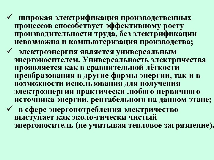 ü широкая электрификация производственных процессов способствует эффективному росту производительности труда, без электрификации невозможна и компьютеризация производства; ü электроэнергия является универсальным энергоносителем. Универсальность электричества проявляется как в сравнительной лёгкости преобразования в другие формы энергии, так и в возможности использования для получения электроэнергии практически любого первичного источника энергии, рентабельного на данном этапе; ü в сфере энергопотребления электричество выступает как эколо гически чистый энергоноситель (не учитывая тепловое загрязнение).