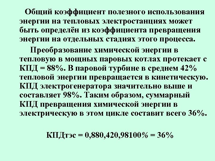 Общий коэффициент полезного использования энергии на тепловых электростанциях может быть определён из коэффициента превращения энергии на отдельных стадиях этого процесса. Преобразование химической энергии в тепловую в мощных паровых котлах протекает с КПД = 88%. В паровой турбине в среднем 42% тепловой энергии превращается в кинетическую. КПД электрогенератора значительно выше и составляет 98%. Таким образом, суммарный КПД превращения химической энергии в электрическую в этом цикле составит всего 36%. КПДтэс = 0, 880, 420, 98100% = 36%