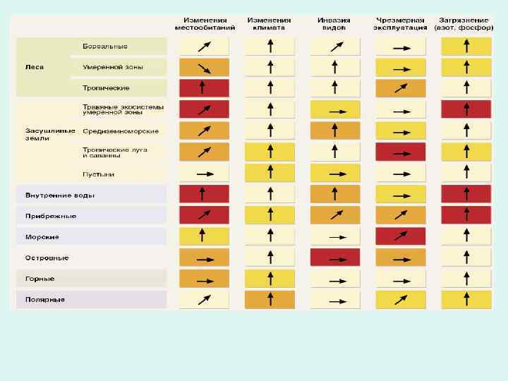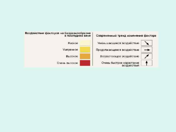 Необратимые изменения биоразнообразия – Распределение видов на Земле становится все более единообразным – Человек ускорил скорость вымирания видов в 1000 раз по сравнению со скоростью, вызванной естественными процессами (средняя достоверность) – 10– 30% видов млекопитающих, птиц и земноводных в настоящее время находятся под угрозой исчезновения (достоверность от средней до высокой)