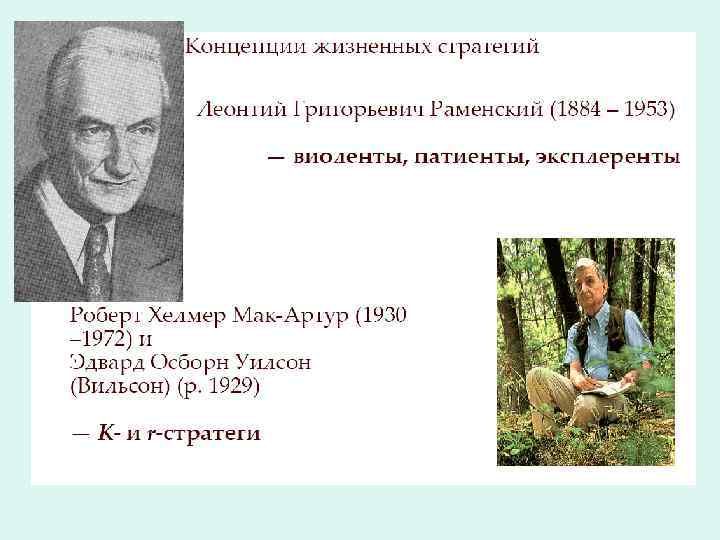 Экологические стратегии выживания • Виоленты (силовики) — подавляют всех конкурентов, например, деревья, образующие коренные леса. • Патиенты — виды, способные выжить в неблагоприятных условиях ( «тенелюбивые» , «солелюбивые» и т. п. ) • Эксплеренты (наполняющие) — виды, способные быстро появляться там, где нарушены коренные сообщества, — на вырубках и гарях (осины), на отмелях и т. д.