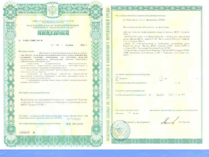 На основании приказа Росгидромета от 07 октября 2013 года № 531 ФГБУ «Северное УГМС» переоформлена лицензия (бессрочная) на осуществление «Деятельности в области гидрометеорологии и в смежных с ней областях (за исключением указанной деятельности, осуществляемой в ходе инженерных изысканий, выполняемых для подготовки проектной документации, строительства, реконструкции объектов капитального строительства)» , которая включает в себя: • определение метеорологических, авиаметеорологических, • • • климатологических, гидрологических, океанологических, гелиогеофизических и агрометеорологических характеристик окружающей среды; определение уровня загрязнения атмосферного воздуха, почв, водных объектов; подготовку и предоставление потребителям прогностической, аналитической и расчетной информации о состоянии окружающей среды, ее загрязнении; формирование и ведение банков данных в области гидрометеорологии и смежных с ней областях.