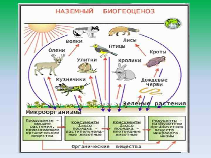 Основные определения. Продолжение Биосфера (от греч. bios - жизнь; sphaire — шар) — оболочка Земли, в которой совокупная деятельность живых организмов проявляется как геохимический фактор планетарного масштаба. Б. — самая крупная экосистема Земли — область системного взаимодействия живого и косного вещества на планете. Включает нижнюю часть атмосферы, всю гидросферу и верхнюю часть литосферы Земли, населённые живыми организмами. Эволюция -естественный процесс развития живой природы, сопровождающийся изменением генетического состава популяций, формированием адаптаций, видообразованием и вымиранием видов, преобразованием экосистем и биосферы в целом. Сукце ссия (от лат. succesio — преемственность, наследование) — последовательная необратимая и закономерная смена одного биоценоза другим на определённом участке среды во времени в результате влияния природных факторов (в том числе внутренних сил) или воздействия человека. Продуценты - это автотрофные организмы, синтезирующие органические вещества с использованием внешних источников энергии Консументы - это гетеротрофные организмы, которые потребляют живую биомассу (и, соответственно, аккумулированную в ней энергию) автотрофов или гетеротрофов. Первичные консументы - это облигатно зависимы от автотрофов гетеротрофы, которые употребляют в пищу биомассу продуцентов Вторичные консументы - потребители биомассы первичных консументов (Волк, ласточка). Редуценты - это гетеротрофные организмы, которые питаются мертвой органикой растительного происхождения (сапрофаги), или органикой (детритофаги). Коэволю ция — совместная эволюция биологических видов, взаимодействующих в экосистеме.