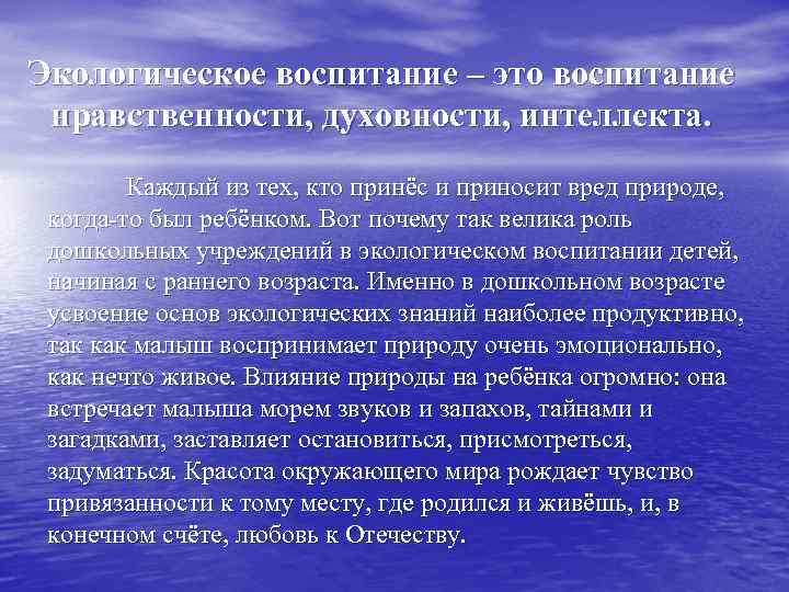Экологическое воспитание – это воспитание нравственности, духовности, интеллекта. Каждый из тех, кто принёс и приносит вред природе, когда-то был ребёнком. Вот почему так велика роль дошкольных учреждений в экологическом воспитании детей, начиная с раннего возраста. Именно в дошкольном возрасте усвоение основ экологических знаний наиболее продуктивно, . так как малыш воспринимает природу очень эмоционально, как нечто живое. Влияние природы на ребёнка огромно: она встречает малыша морем звуков и запахов, тайнами и загадками, заставляет остановиться, присмотреться, задуматься. Красота окружающего мира рождает чувство привязанности к тому месту, где родился и живёшь, и, в конечном счёте, любовь к Отечеству.