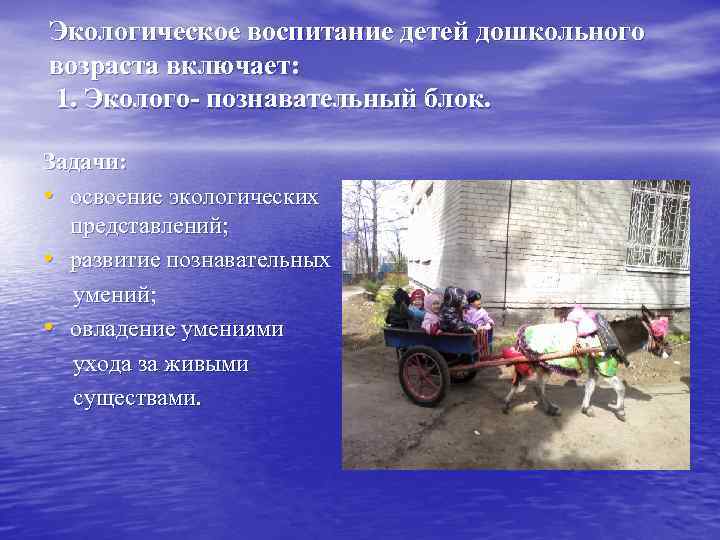 Экологическое воспитание детей дошкольного возраста включает: 1. Эколого- познавательный блок. Задачи: • освоение экологических представлений; • развитие познавательных умений; • овладение умениями ухода за живыми существами.