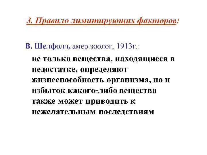 Закон минимума Либиха • Рост и развитие организмов зависят в первую очередь от тех факторов природной среды, значение которых приближается к экологическому минимуму