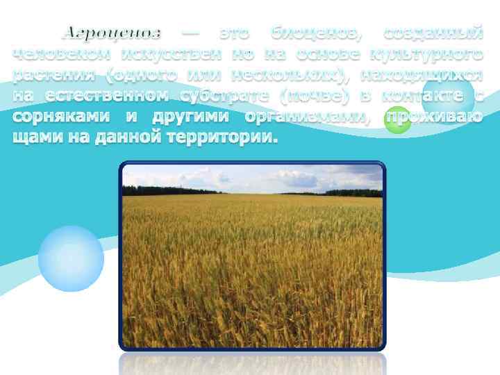 Типы агроценозов: агроценоз состоит из одно или несколько культурных растений (поле пшеницы, вишневый сад, виноградник) агроценоз составляет естественное растительное сообщество, которое обогащается дополнительными видами культурных растений (в естественные луга подсевают зернобобовые и злаковые культуры, обладающие высокой продуктивностью)