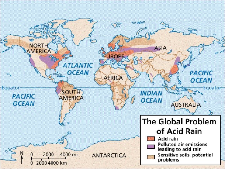 Основные источники кислотных дождей SO 2 Естественные источники (40%) NOx Антропогенные источники (60%) вулканическая деятельность, деятельность микроорганизмов Антропогенные источники (63%) ТЭС, автотранспорт, промышленность Естественные источники (37%) почвенная эмиссия, грозовые разряды, горение биомассы