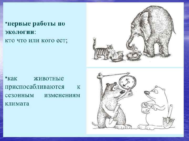 Экологические идеи в XIX веке • Ж. Л. Бюффон: писал о влиянии климата на животные организмы • Ж. Б. Ламарк: обращал внимание на роль внешних условий в эволюции • А. де Кондоль: описывал влияния факторов неживой природы на растения • А. Т. Болотов: разработал классификацию местообитаний растений • А. Гумбольт: описывал тесную связь между растительностью и средой
