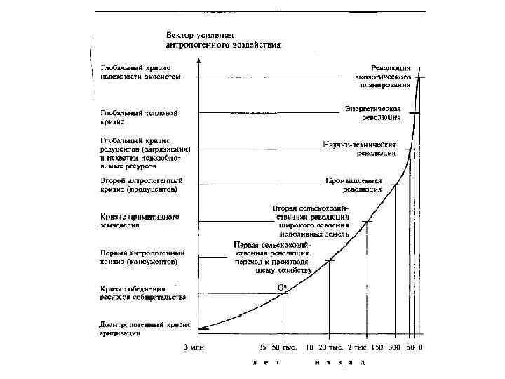 Экологические кризисы и экологические революции в истории человечества Время Экологический кризис Экологическая революция Настоящее время Снижение надежности экологических систем Формирование ноосферы 10— 20 лет назад Недостаток энергии, производимой традиционными методами Максимальная экономия энергии, использование альтернативных источников энергии 30— 50 лет назад Нехватка минеральных ресурсов, глобальное загрязне ние планеты Реутилизация продуктов, замыкание технологических циклов 150— 350 лет назад Сведение лесов, общее истощение растительных ресурсов Широкое применение минеральных ресурсов 2 тыс. лет назад Кризис примитивного земледелия Широкое освоение неполивных земель 10— 30 тыс. лет назад Перепромысел крупных животных Развитие орошаемого земледелия и скотоводства 35— 50 тыс. лет назад Обеднение доступных древним людям ресурсов промысла и собирательства Выжигание растительности и массовые охоты