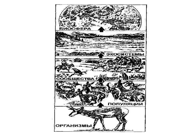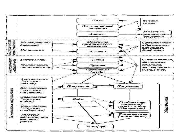 • Сообщество, популяция, организм, орган, клетка и ген — основные уровни организации жизни. Расположены в иерархическом порядке — от крупных систем к малым. На каждом уровне или ступени в результате взаимодействия с окружающей физической средой (энергией и веществом) возникают характерные функциональные системы. • Под системой понимаются упорядоченно взаимодействующие и взаимозависимые компоненты, образующие единое целое. Экология изучает главным образом системы выше уровня организма.