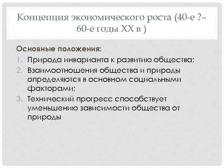 Концепция экономического роста (40 -е ? – 60 -е годы XX в ) Основные положения: 1. Природа инварианта к развитию общества; 2. Взаимоотношения общества и природы определяются в основном социальными факторами; 3. Технический прогресс способствует уменьшению зависимости общества от природы