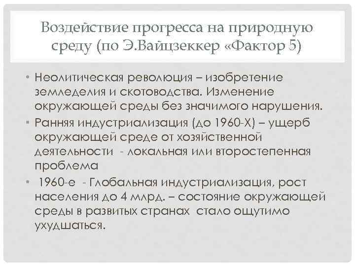 Воздействие прогресса на природную среду (по Э. Вайцзеккер «Фактор 5) • Неолитическая революция – изобретение земледелия и скотоводства. Изменение окружающей среды без значимого нарушения. • Ранняя индустриализация (до 1960 -Х) – ущерб окружающей среде от хозяйственной деятельности - локальная или второстепенная проблема • 1960 -е - Глобальная индустриализация, рост населения до 4 млрд. – состояние окружающей среды в развитых странах стало ощутимо ухудшаться.