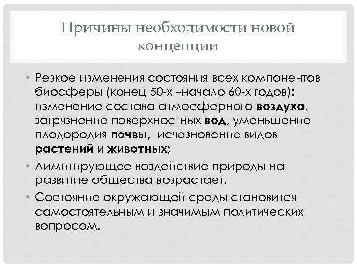 Причины необходимости новой концепции • Резкое изменения состояния всех компонентов биосферы (конец 50 -х –начало 60 -х годов): изменение состава атмосферного воздуха, загрязнение поверхностных вод, уменьшение плодородия почвы, исчезновение видов растений и животных; • Лимитирующее воздействие природы на развитие общества возрастает. • Состояние окружающей среды становится самостоятельным и значимым политических вопросом.