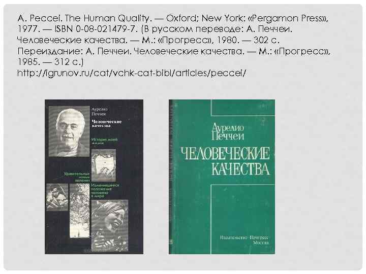 A. Peccei. The Human Quality. — Oxford; New York: «Pergamon Press» , 1977. — ISBN 0 -08 -021479 -7. (В русском переводе: А. Печчеи. Человеческие качества. — М. : «Прогресс» , 1980. — 302 с. Переиздание: А. Печчеи. Человеческие качества. — М. : «Прогресс» , 1985. — 312 с. ) http: //igrunov. ru/cat/vchk-cat-bibl/articles/peccei/